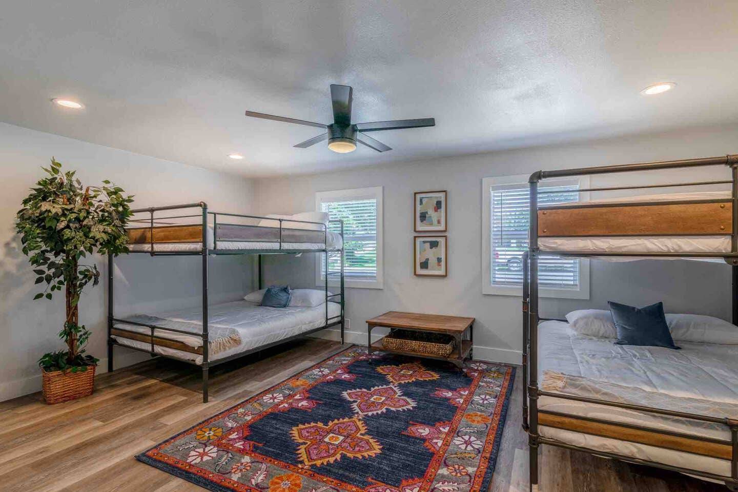 This spacious home encompasses 4 bedrooms + 1 bedroom detached casita, and 2 bathrooms. Bedroom 1: 4 queen beds Bedroom 2: 4 queen beds Bedroom 3: 2 queen beds Bedroom 4: 2 queen beds Bedroom 5 ( Detached Casa): 2 queen beds Dishes and dinnerware for 16+, blender, toaster, Keurig, and more! Neighborhood: We are located between South First & South Congress, In the heart of Austin, Texas. 6th street & Rainey street- 6 mi. 10-15 mins